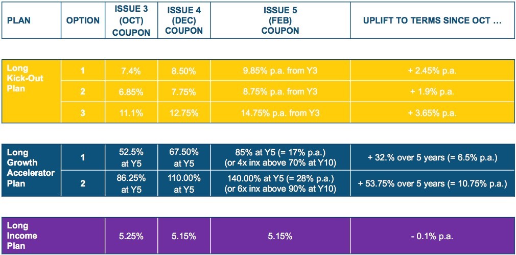 > the coupon for option 2 of the Long Growth Accelerator Plan, at the 5-year kick-out point, now offers an incredible 140%, i.e. 28% p.a., an additional 10.75% p.a.